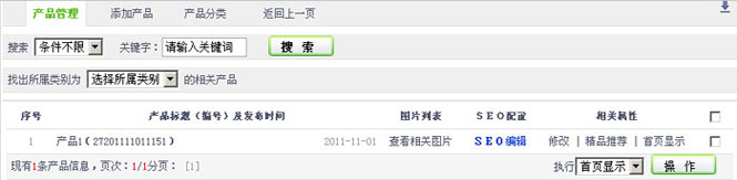 1.在“搜索”字段,搜索特定的某条产品,以便进行管理。2.在“找出所属类别为”字段,使用产品类别对产品列表进行虑选,选取特定的分类,以便进行管理。3.在“在产品列表”,设置产品的SEO配置(详细【3.4.1】章节进行介绍)、修改、是否推荐,是否首页显示、删除等操作。