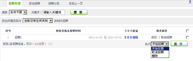 3.在“在招聘列表”,设置招聘的SEO配置(详细【3.4.1】章节进行介绍)、修改、取消招聘,删除等操作。