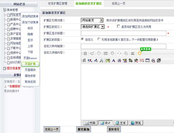 左则菜单管理>鼠标右键>页面扩展>添加新的扩展区,如下图;