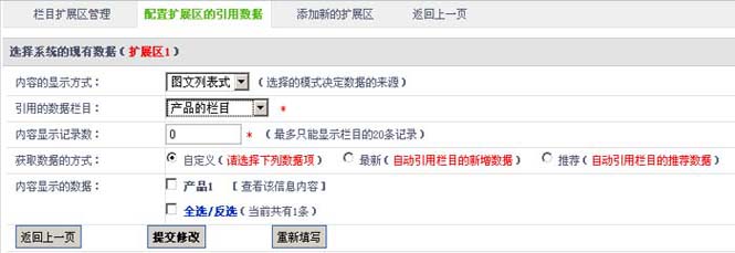 7.在“配置扩展区的引用数据”,可以配置引用网站内的哪图文或是栏目的数据如下图: