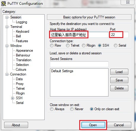 下载完成后,打开软件,分别输入IP地址,端口默认是22,如有修改端口,请对应填写,点击打开,如图1-4所示: