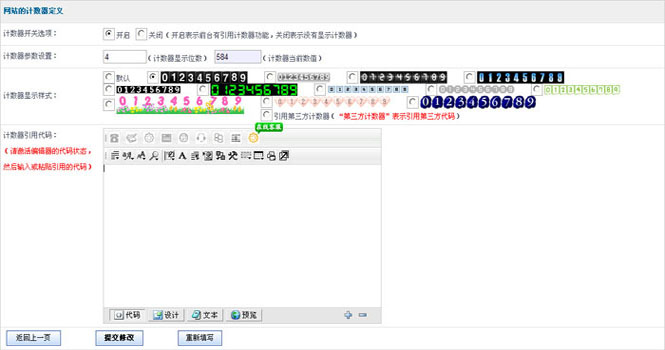 启用网站计数器功能,可以您查看您网站被人访问的次数。目前系统的计数器,运行稳定、显示速度快、12种丰富计数器图片样式提供选择。